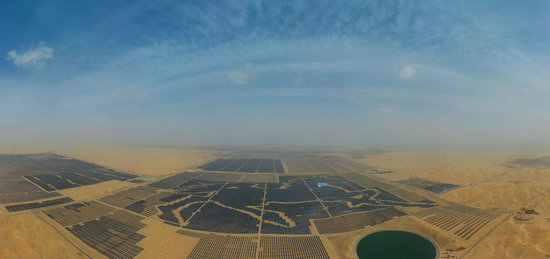 在內(nèi)蒙古自治區(qū)鄂爾多斯市境內(nèi)的庫布其沙漠里,一排排光伏板整齊地排列著,像是一幅藍色畫布在沙海中熠熠生輝。然而在過去,“黃沙遮天日,飛鳥無棲樹”是人們對這片沙海的印象。