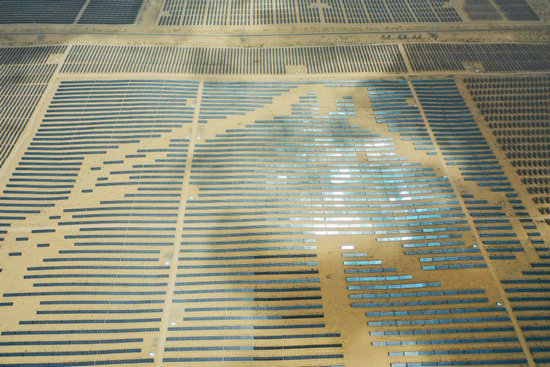 在幾十公里外的達拉特旗光伏發(fā)電應用領跑基地,一塊塊光伏板連成一片,墨藍色的“光伏長城”閃閃發(fā)光。