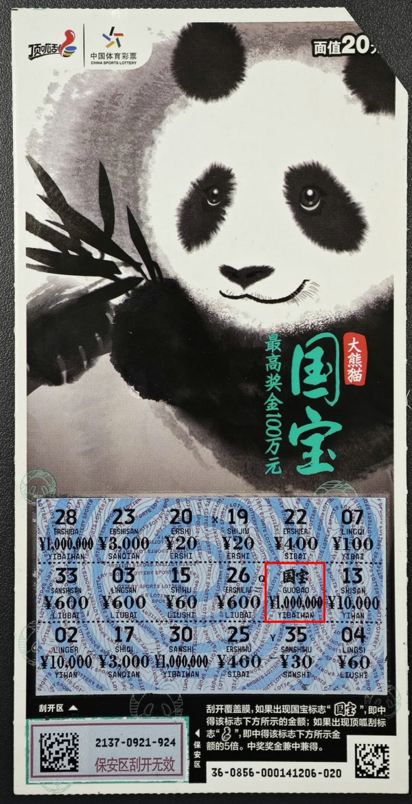 位于綿陽涪城區(qū)永惠路北段51號的5107021577門店,在近期中出頂呱刮“國寶”頭獎。當(dāng)天,一位身穿紅衣的購彩者在柜臺觀察后,選擇了票面描繪著神態(tài)栩栩如生的“國寶”即開票。隨著一個國寶標(biāo)志被刮出,紅衣小哥發(fā)出“咦”的一聲驚嘆,低頭仔細(xì)的數(shù)起了位數(shù):“個、十、百、千、萬、十萬,一百萬??!”旁邊購彩者不敢相信的湊了過來,一起觀察起這張百萬獎票,購彩者也開心的拿出手機拍下了中獎瞬間,記錄自己見證大獎?wù)Q生的時刻。
