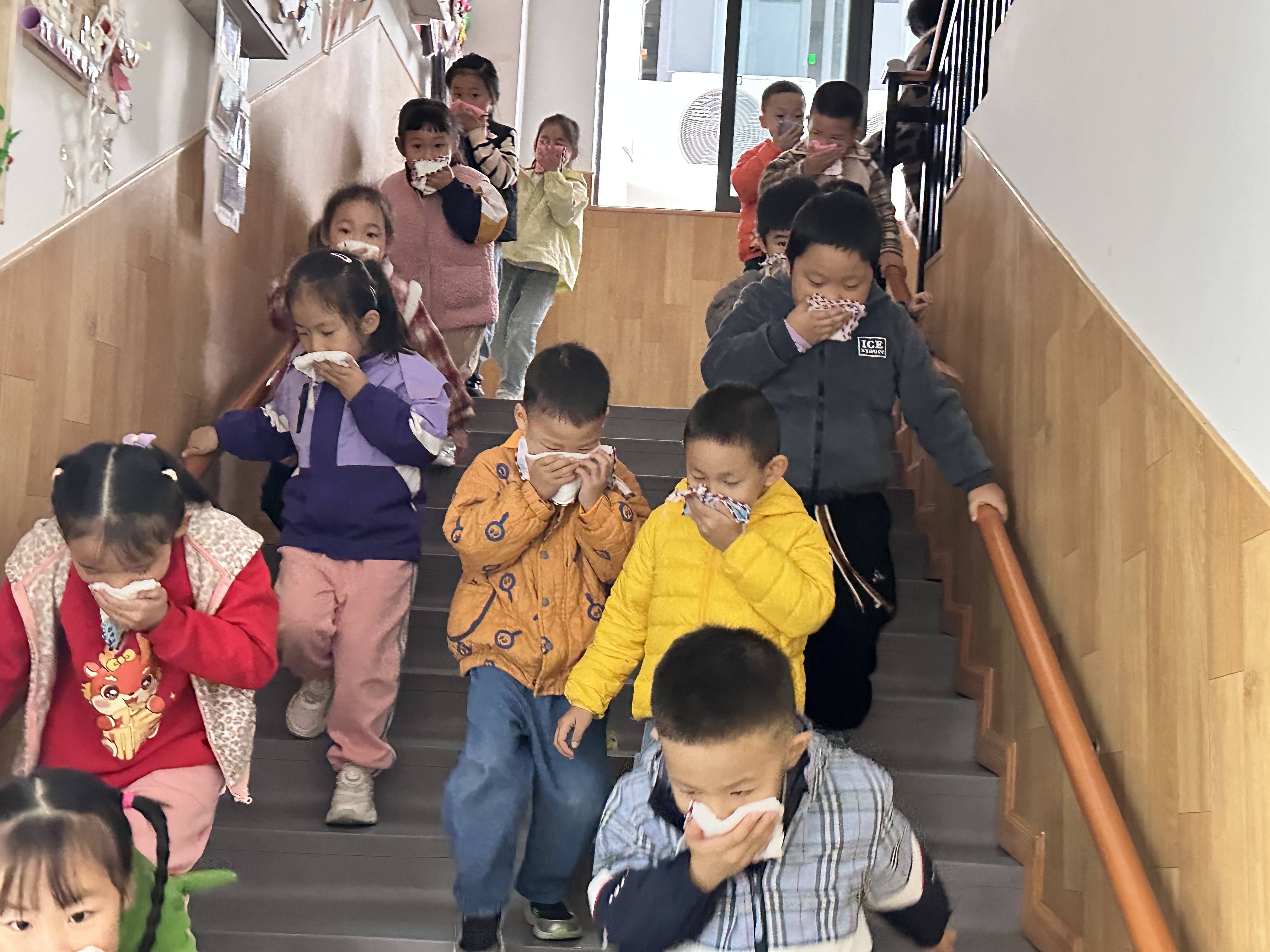 隨著一陣陣急促的警報(bào)聲突然響起,各班教師迅速按照疏散路線帶領(lǐng)幼兒用濕毛巾捂住口鼻,彎腰俯身,快速有序地撤離到安全地帶。