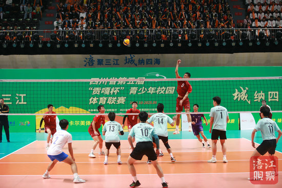 開(kāi)幕儀式后,綿陽(yáng)市東辰學(xué)校和成都市新都區(qū)升庵中學(xué)進(jìn)行了一場(chǎng)男子排球高中組比賽。在這場(chǎng)體育盛會(huì)的揭幕戰(zhàn)上,運(yùn)動(dòng)員們?cè)诩ち业墓シ缿?zhàn)中揮灑汗水,用奮勇拼搏的身姿展現(xiàn)出了“貢嘎杯”的體育精神。