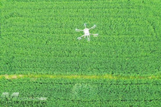 涪城區(qū)吳家鎮(zhèn),無(wú)人機(jī)在田間施肥。(記者 陳冬冬 攝)