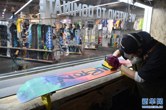 在陜西西安市一家滑雪裝備店里,店面負(fù)責(zé)人趙凱在保養(yǎng)客戶的滑雪板。新華社記者 邵瑞 攝