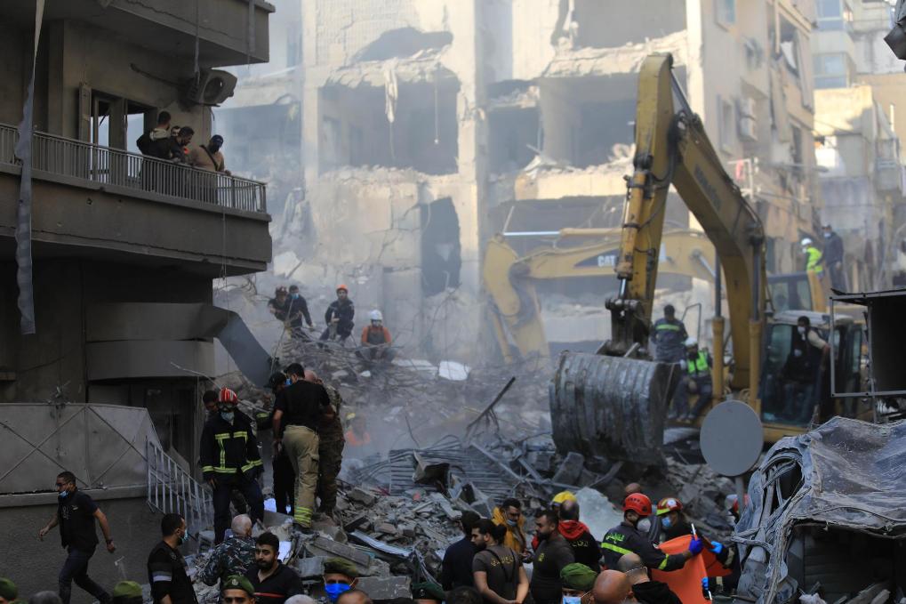 11月23日,在黎巴嫩貝魯特,人們在遭空襲的建筑廢墟參與搜救。新華社發(fā)