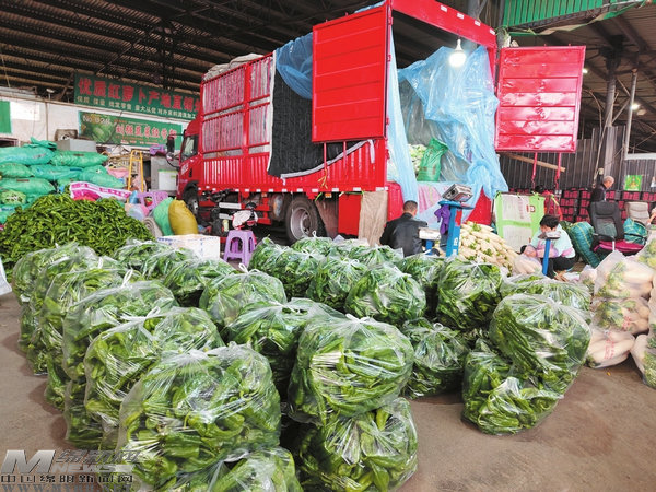在高水批發(fā)市場里,滿載著各類蔬菜的貨車正在下貨。