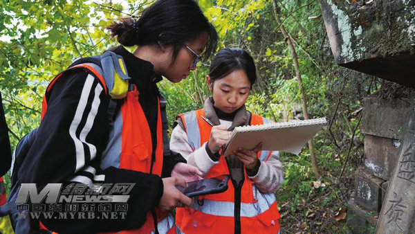 李欣月和隊友在吳氏墓群記錄普查數(shù)據(jù)
