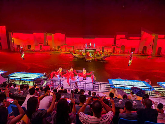 ?。冈拢保等胀恚诎不帐↑S山市黟縣宏村景區(qū)旁,大型實景演出《宏村阿菊》正在上演。新華社記者 郭晨 攝