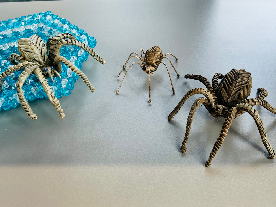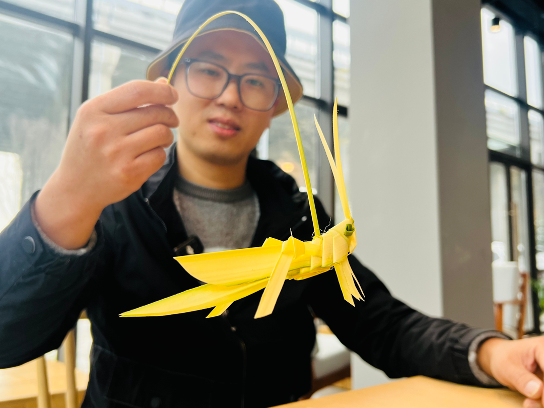 就說編織一只靈動的螞蚱,先挑出柔韌適度的棕葉,溫水泡軟、晾干,讓葉片“溫順聽話”。開工時,將棕葉從中撕開,折出螞蚱的軀干雛形,這一“折”得把控好力度,確保身形勻稱;緊接著,用細條棕葉穿插、“壓”合,固定腿部與翅膀的位置,稍有偏差,螞蚱就會歪扭不成形;再通過巧妙“穿”針引線,賦予螞蚱細長觸須與關(guān)節(jié)細節(jié);收尾時,輕輕“拉”動調(diào)整,讓整體緊湊逼真。為練這一系列動作,李兵反復揣摩,上萬次的練習,讓他手法愈發(fā)嫻熟。