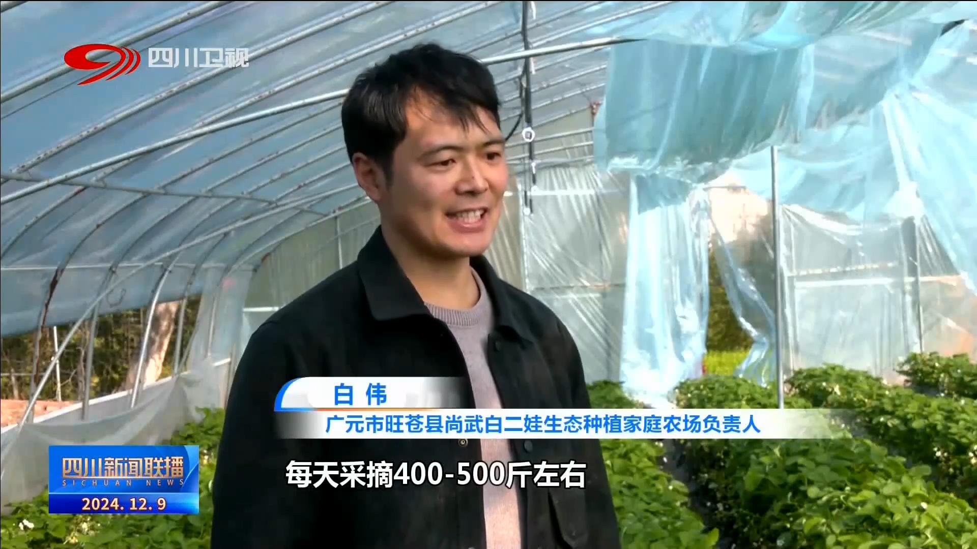 廣元市旺蒼縣尚武白二娃生態(tài)種植家庭農(nóng)場負(fù)責(zé)人 白偉:每天采摘400-500斤左右,所有的草莓都是通過蜜蜂授粉,減少我們草莓的畸形果。