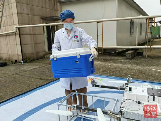 當(dāng)日,綿陽市中心血站收到綿陽市中心醫(yī)院無人機(jī)送血申請后,工作人員取出匹配的血液,第一時(shí)間將血液運(yùn)輸箱裝進(jìn)無人機(jī)配送箱里。