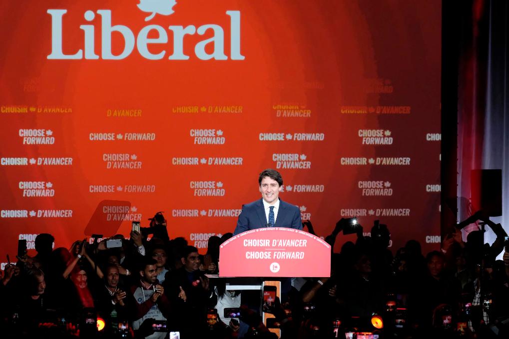 2019年10月21日,在加拿大蒙特利爾,加拿大總理特魯多在自由黨競選總部參加活動(dòng)。新華社發(fā)(拉菲·克爾德攝)