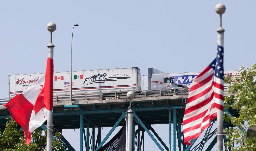 2017年8月16日,在加拿大安大略省溫莎市,一輛印有墨西哥、加拿大與美國國旗的長途貨車(左)通過大使橋開往美國。新華社發(fā)(鄒崢攝)
