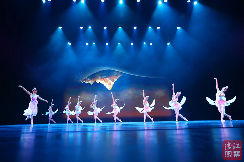 原創(chuàng)現(xiàn)代芭蕾舞《涪鷗》壓軸登場,演員們旋轉(zhuǎn)、跳躍,優(yōu)美的舞姿、靈動的舞步,宛如美麗的紅嘴鷗迎風(fēng)展翅飄逸空中,展現(xiàn)出紅嘴鷗春去冬來,扎根涪江邊,人與自然和諧共生的大美畫卷,把氛圍推向高潮,現(xiàn)場響起經(jīng)久不息的掌聲。