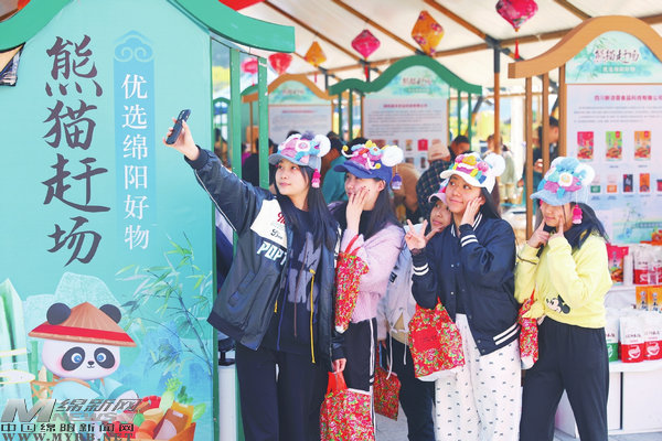 十二月十九日,在綿陽市“文化三”推深圳行活動熊貓趕場展區(qū),觀眾拍照打卡。(記者陳冬冬攝)