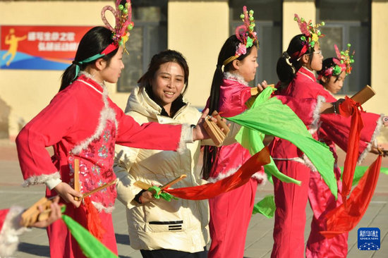 12月22日,在南皮縣馮家口鎮(zhèn)車官屯小學,滄州落子藝人在指導學生練習滄州落子。