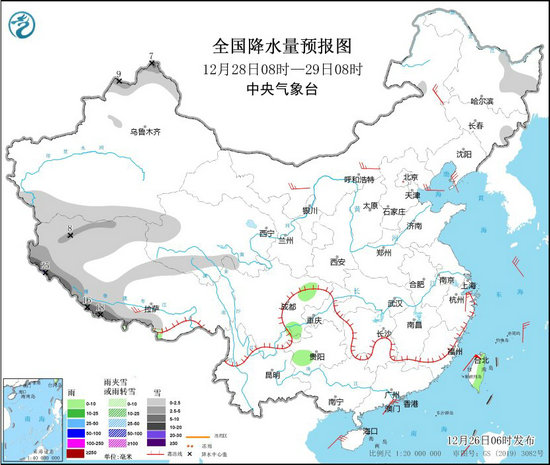 12月28日08時至29日08時,新疆北疆北部、西藏北部和西南部、青海南部和西部、黑龍江東北部、吉林東部等地部分地區(qū)有小到中雪,其中,新疆北疆北部高海拔地區(qū)、西藏西南部等地部分地區(qū)有大到暴雪,西藏西南部局地大暴雪(20~25毫米)。四川盆地北部和西南部、貴州西南部、臺灣島東部等地部分地區(qū)有小雨。西藏南部、內(nèi)蒙古中西部、遼東半島、浙江東部沿海等地部分地區(qū)有4~6級風(fēng);黃海南部海域、臺灣海峽、臺灣以東洋面、巴士海峽、南海北部和中部海域、北部灣將有7~8級、陣風(fēng)9~10級的大風(fēng)。