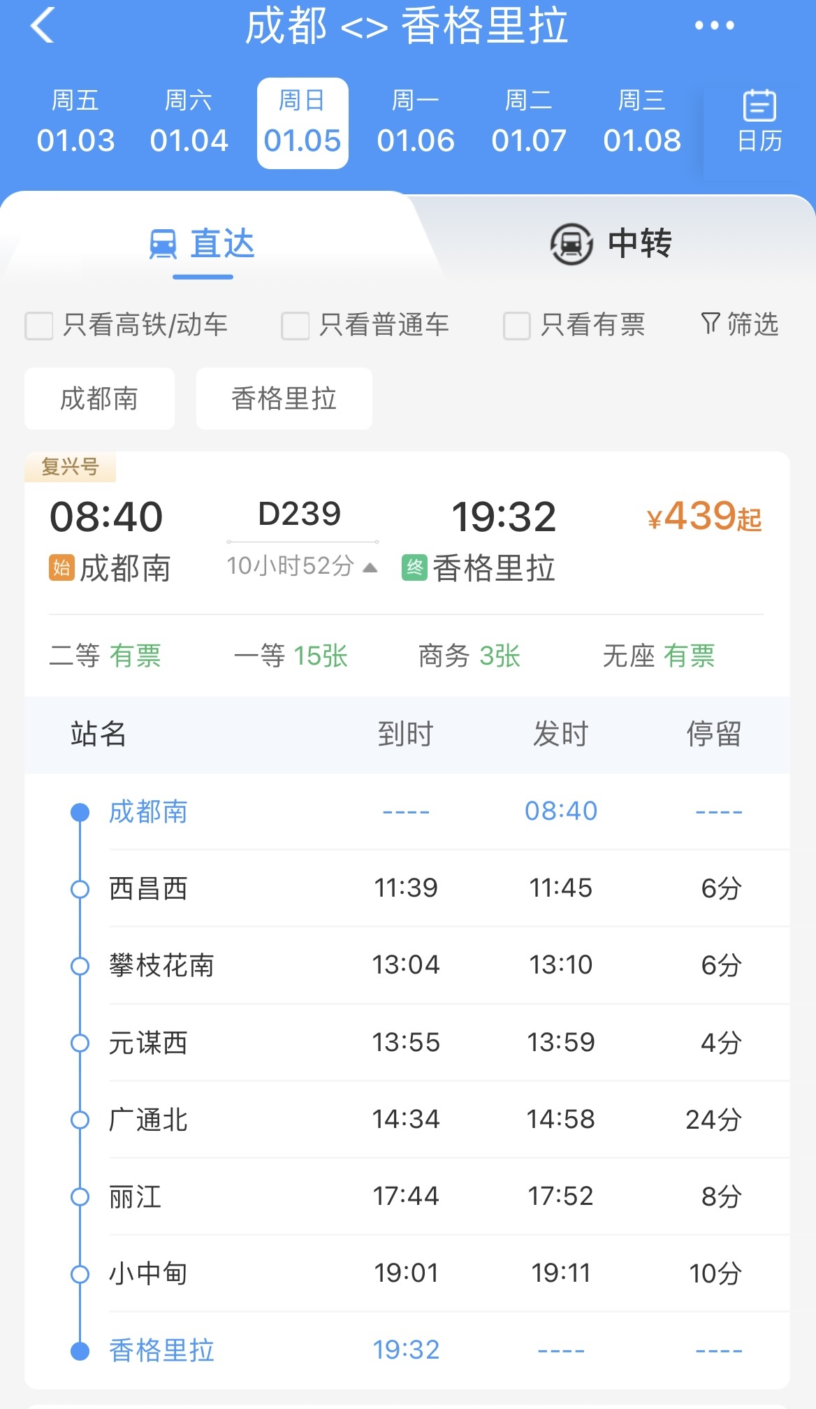 新開行的D239次列車,8點40分從成都南發(fā)車,19點32分到達香格里拉,全程10小時52分鐘,途經(jīng)西昌西、攀枝花南、元謀西、廣通北、麗江、小中甸等站點。鐵路12306公布票價顯示,成都南至香格里拉二等票價439元,一等票價702元,商務票價1462元。