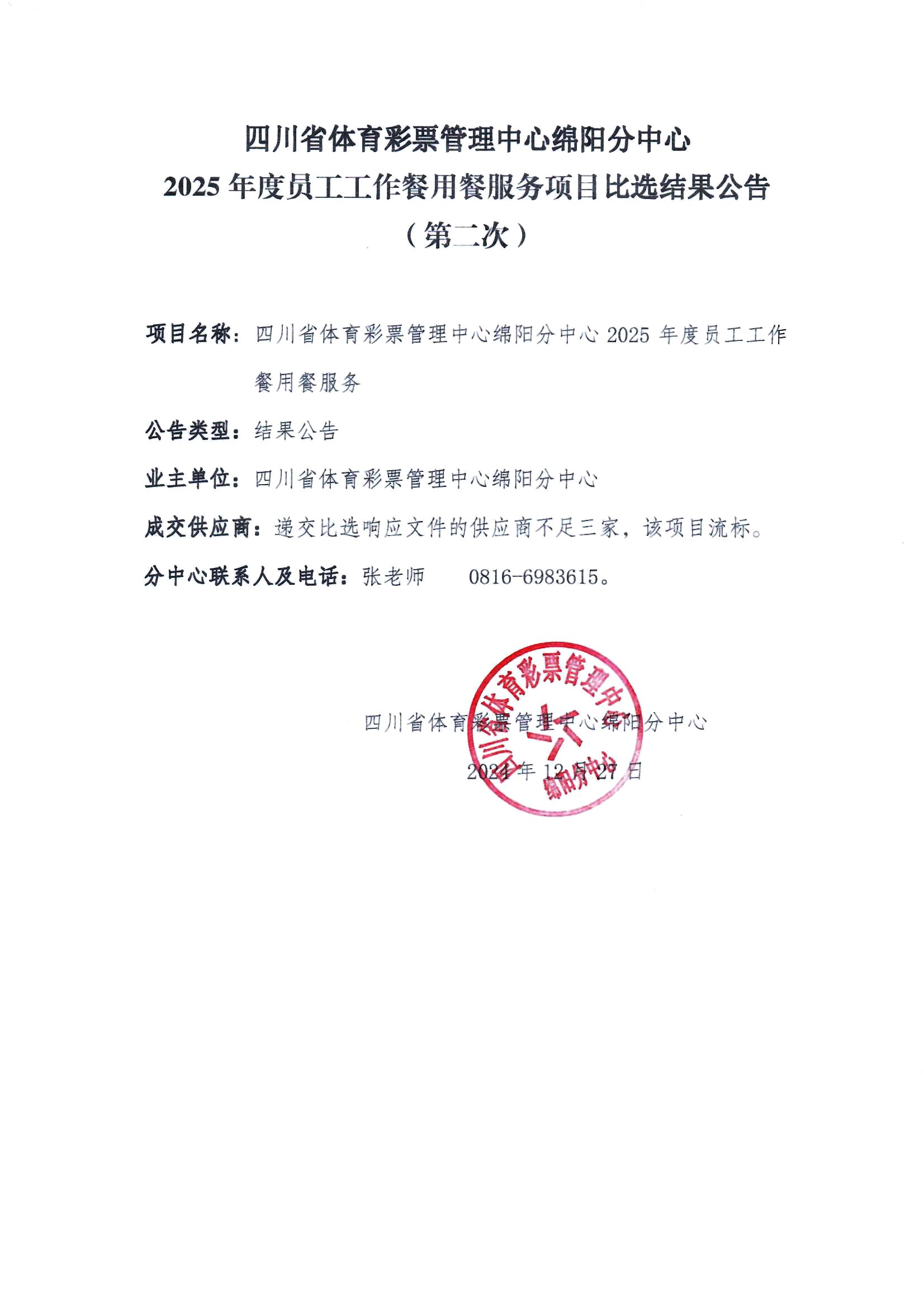 四川省體育彩票管理中心綿陽分中心2025年度員工工作餐用餐服務(wù)項(xiàng)目比選結(jié)果公告(第二次)