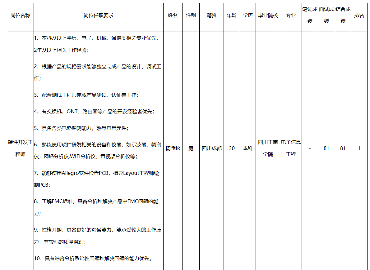 根據(jù)四川九州電子科技股份有限公司發(fā)布的招聘公告及招聘相關(guān)規(guī)定,經(jīng)筆試、面試等程序,現(xiàn)將筆試(面試)成績予以公示。