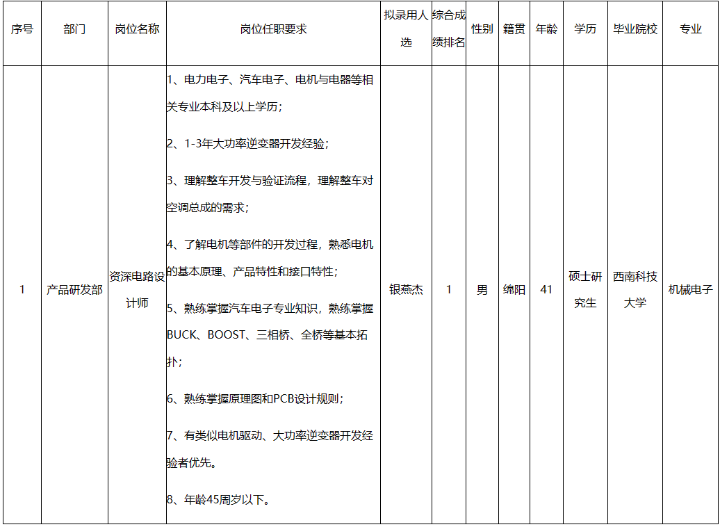根據(jù)四川愛創(chuàng)科技有限公司發(fā)布的招聘公告及招聘相關(guān)規(guī)定,經(jīng)面試、考察、體檢等程序,擬錄用銀燕杰同志到產(chǎn)品研發(fā)部工作,現(xiàn)予以公示,具體情況如下:
