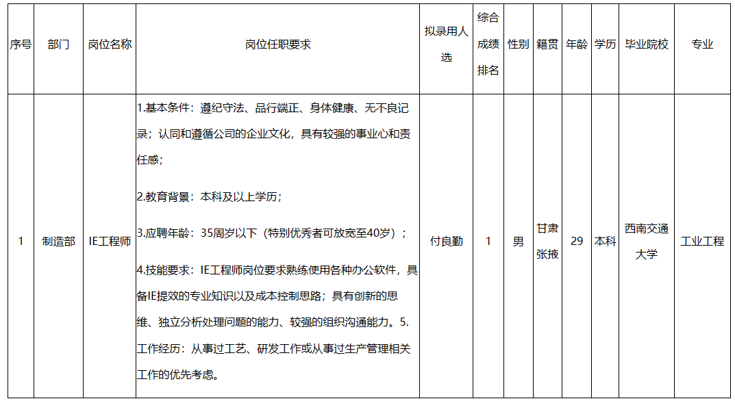 根據(jù)四川長虹空調(diào)有限公司發(fā)布的招聘公告及招聘相關(guān)規(guī)定,經(jīng)面試、體檢等程序,擬錄用付良勤到長虹空調(diào)工作,現(xiàn)予以公示,具體情況如下: