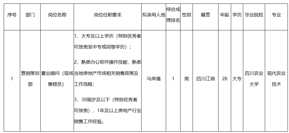 根據(jù)四川長(zhǎng)虹置業(yè)有限公司發(fā)布的招聘公告及招聘相關(guān)規(guī)定,經(jīng)筆試、面試、考察、體檢等程序,擬錄用馬榮福同志到四川長(zhǎng)虹置業(yè)有限公司工作,現(xiàn)予以公示,具體情況如下:
