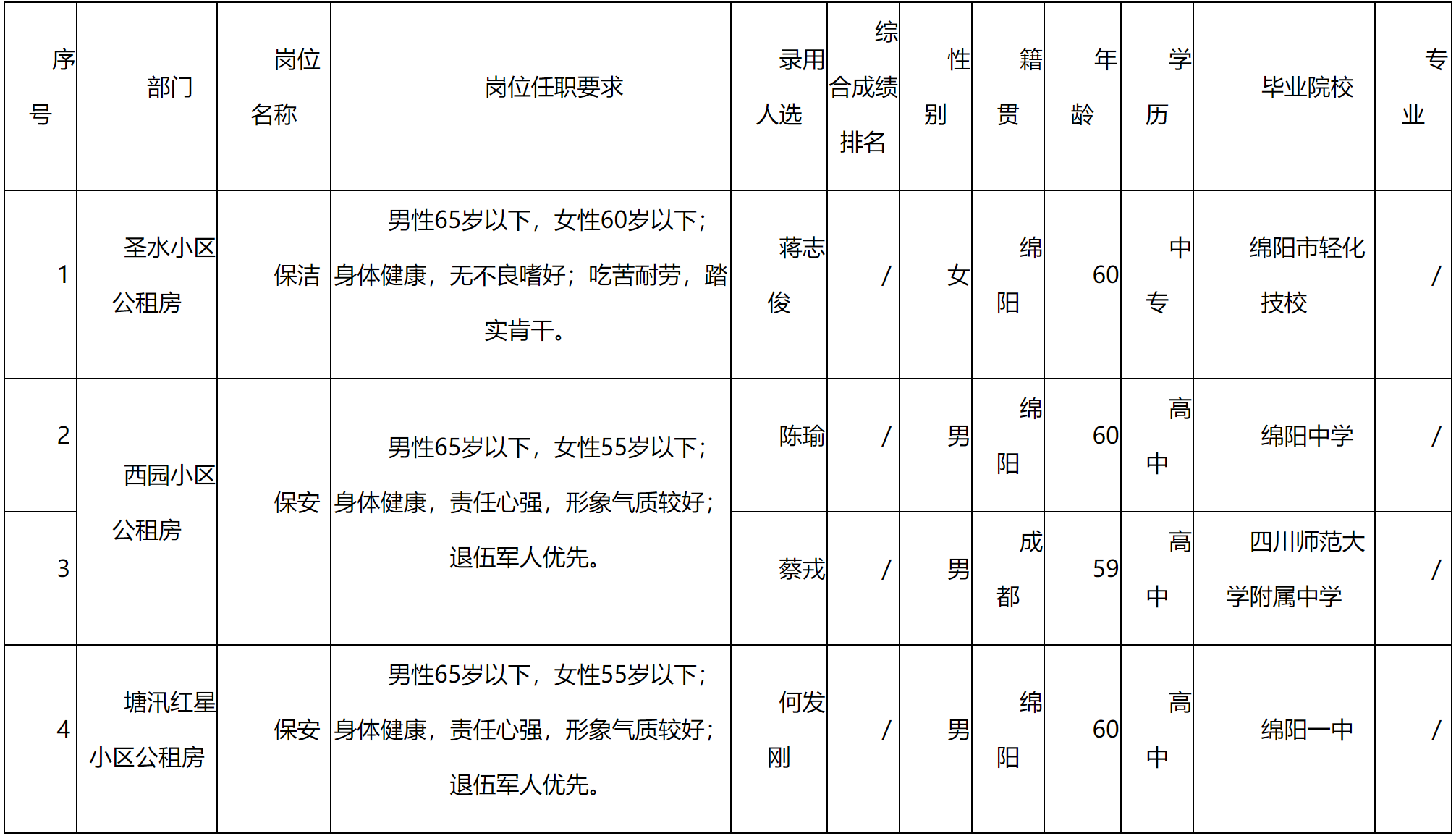 根據(jù)康居公司發(fā)布的長期招聘一線勤雜人員的招聘公告相關(guān)規(guī)定,經(jīng)面試、體檢等程序,錄用以下人員到綿陽市康居房產(chǎn)經(jīng)營管理有限公司各公租房管理處工作,現(xiàn)予以公示,具體情況如下: