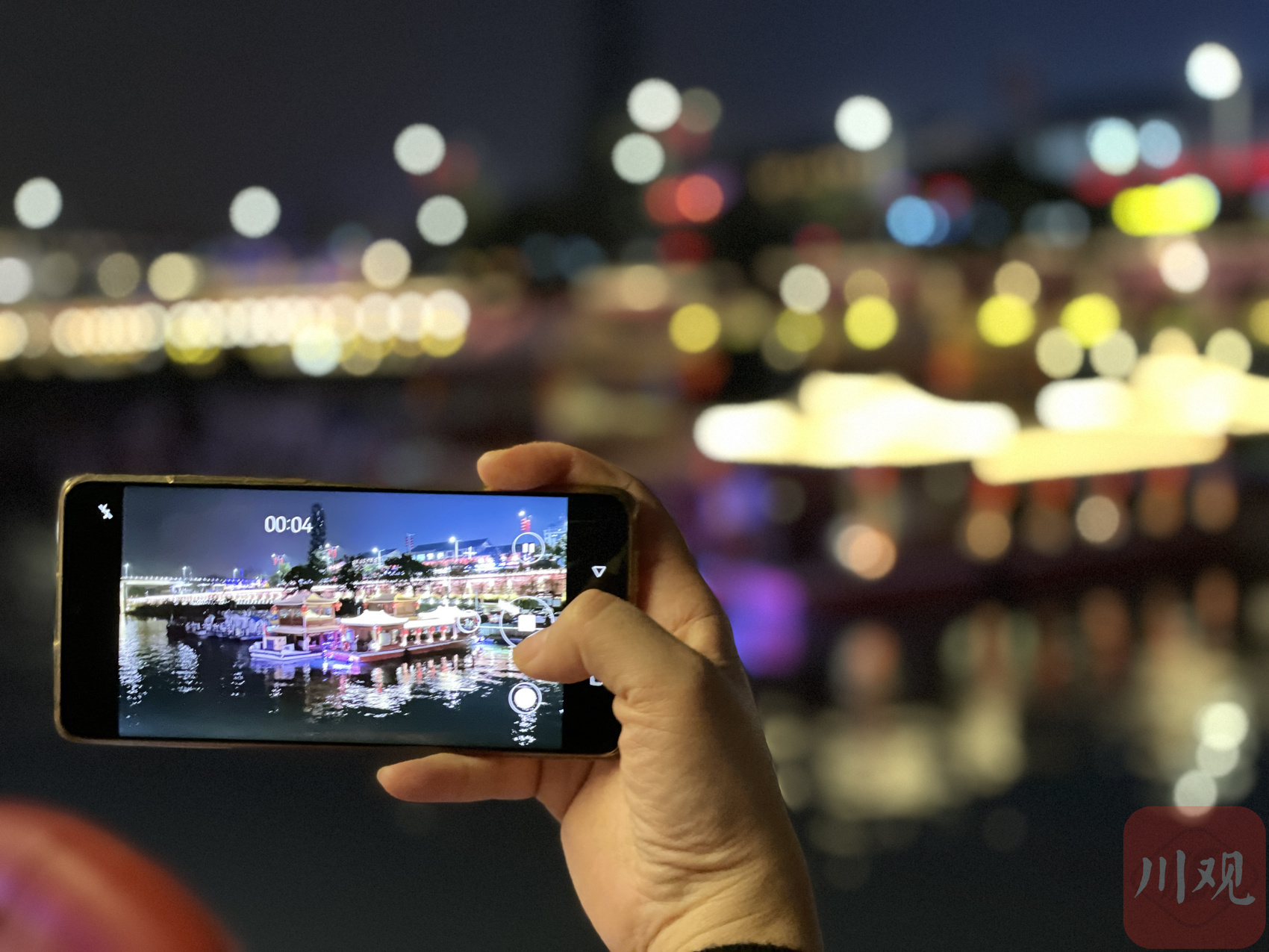 頂樓上的游客,無不舉著手機(jī),拍照拍視頻。胡倩直接開了視頻,給遠(yuǎn)在山西的妹妹“直播”。“我們是來南充參加婚禮的。”她告訴記者,自己請(qǐng)了年假,和愛人順便在周邊玩兩天,玩了古城后,聽說晚上還有游船表演,就多留了一晚。