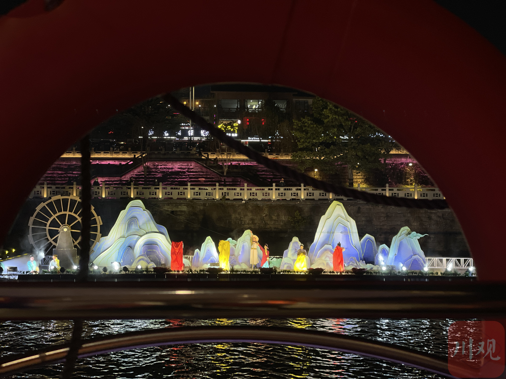 不一會(huì),音樂響起,演出開始了!右側(cè),遠(yuǎn)處岸上一輪“圓月”,月亮里人影窈窕,水袖舞動(dòng),翩躚裊娜;“月亮”隱去后,一艘演出船從右側(cè)趕上與游船平行,燈光乍亮,正戲開場(chǎng)。表演以杜甫、王刺史游覽閬中嘉陵江為主線,隨著游船行進(jìn),巧妙穿插進(jìn)《長安三萬里》詩詞文化元素,輔以江兩岸的燈光,引人入勝。