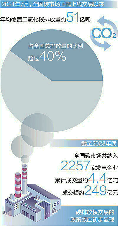 2021年7月全國碳市場正式上線交易以來,運(yùn)行整體平穩(wěn),年均覆蓋二氧化碳排放量約51億噸,占全國總排放量的比例超過40%。截至2023年底,全國碳市場共納入2257家發(fā)電企業(yè),累計(jì)成交量約4.4億噸,成交額約249億元,碳排放權(quán)交易的政策效應(yīng)初步顯現(xiàn)。