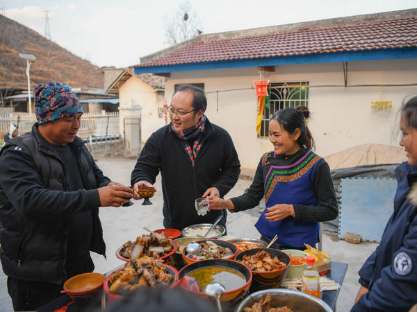 2月2日,在越西縣板橋鎮(zhèn)桃園村,新華社記者周科(左二)與巴木玉布木一家共進(jìn)晚餐。新華社記者 王曦 攝