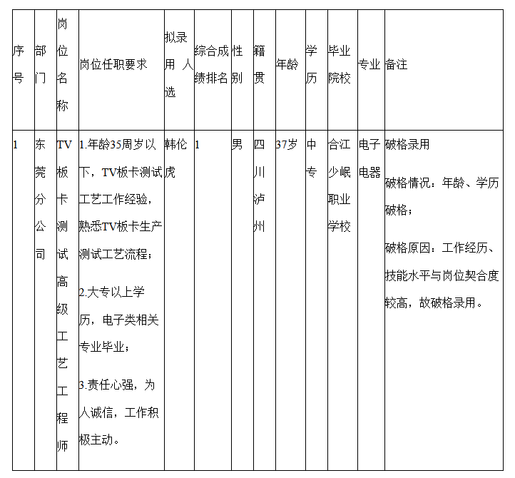 根據(jù)四川愛聯(lián)科技股份有限公司發(fā)布的招聘公告及招聘相關(guān)規(guī)定,經(jīng)筆試、面試、考察、體檢等程序,擬錄用韓倫虎同志到東莞分公司任職TV板卡測試高級工藝工程師,現(xiàn)予以公示,具體情況如下: