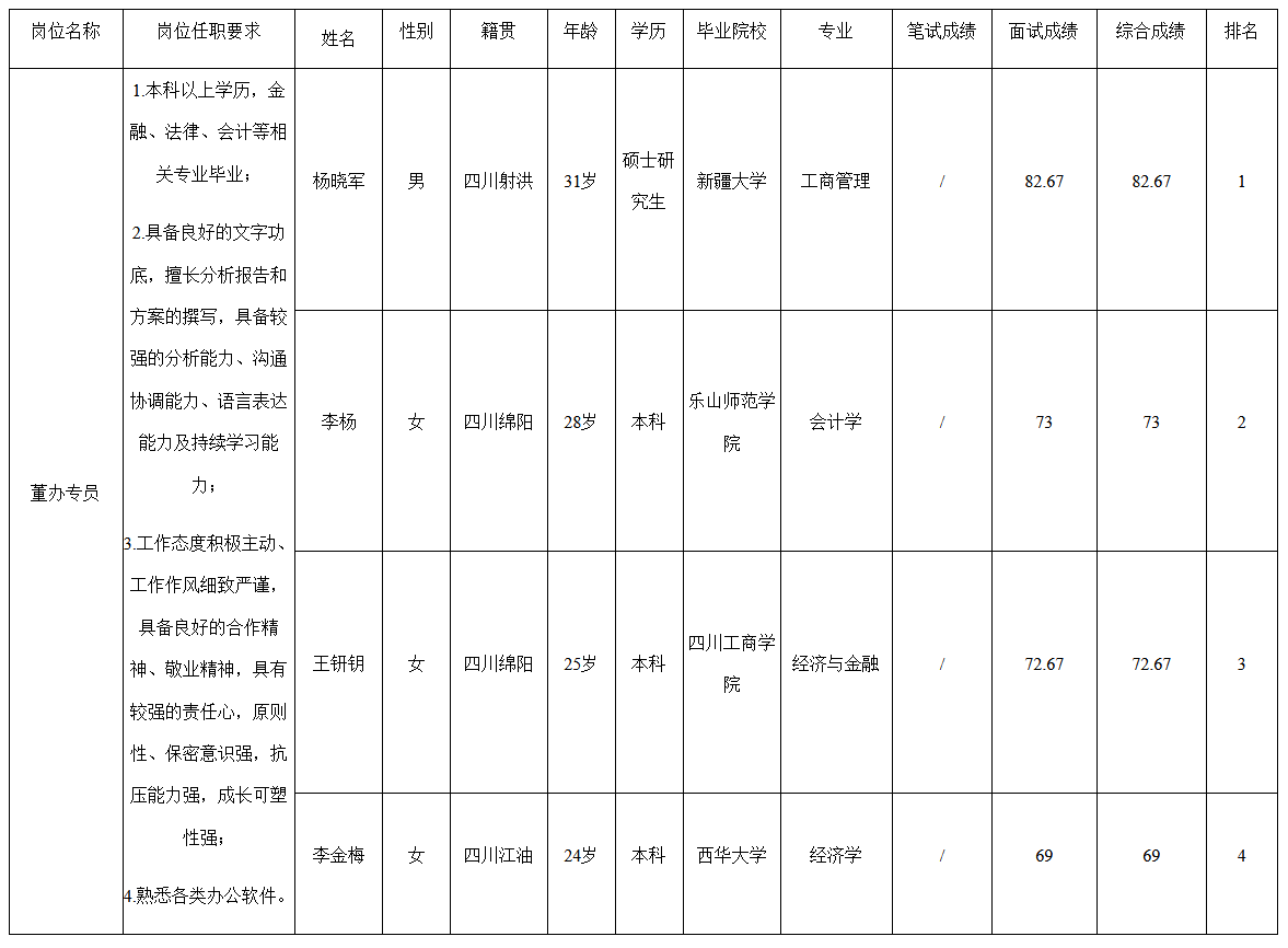 根據(jù)四川愛聯(lián)科技股份有限公司發(fā)布的招聘公告及招聘相關(guān)規(guī)定,經(jīng)筆試、面試等程序,現(xiàn)將筆試(面試)成績(jī)予以公示。