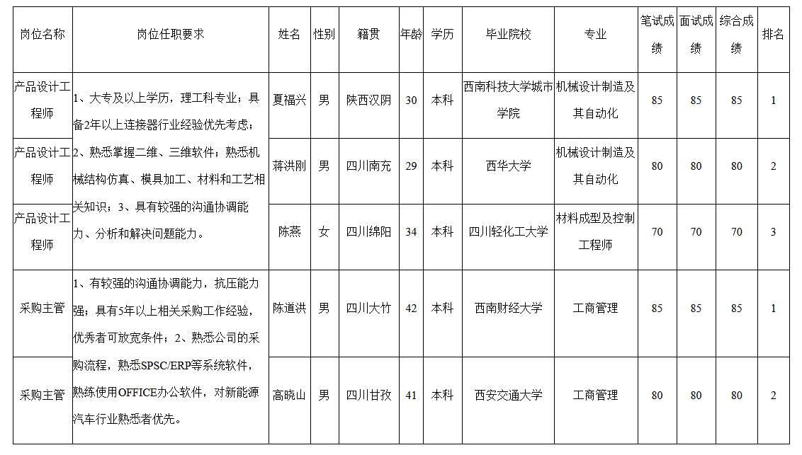 根據(jù)四川華豐科技股份有限公司發(fā)布的招聘公告及招聘相關(guān)規(guī)定,經(jīng)筆試、面試等程序,現(xiàn)將筆試(面試)成績予以公示。