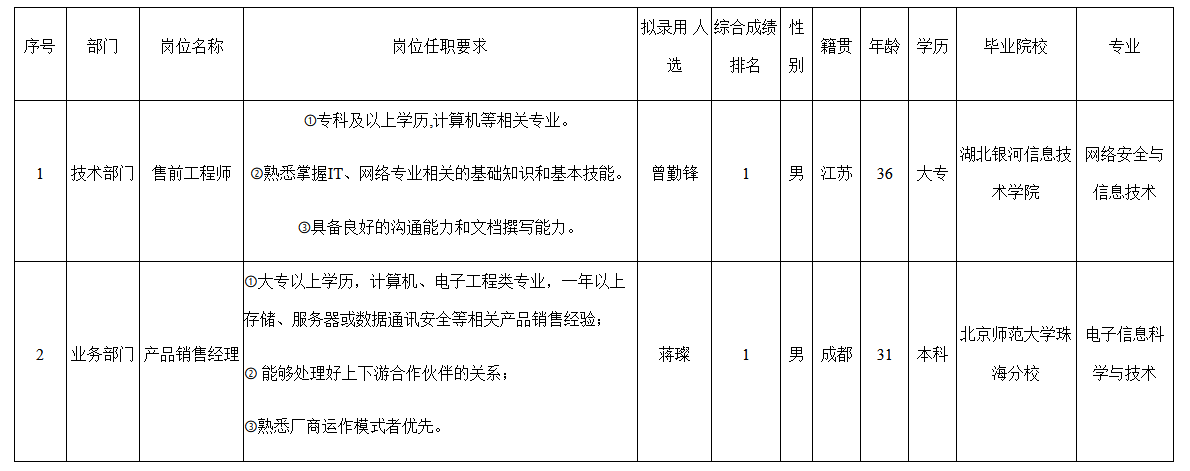 根據(jù)四川長虹佳華信息產(chǎn)品有限責任公司發(fā)布的招聘公告及招聘相關(guān)規(guī)定,經(jīng)面試、考察、體檢等程序,擬錄用曾勤鋒、蔣璨同志到四川長虹佳華信息產(chǎn)品有限責任公司工作,現(xiàn)予以公示,具體情況如下: