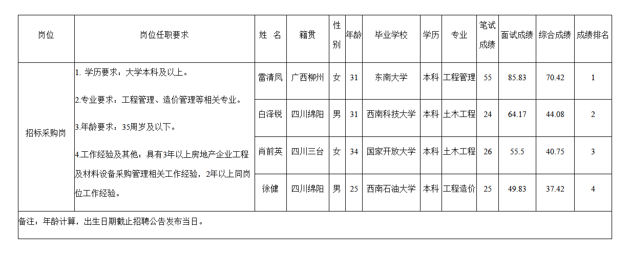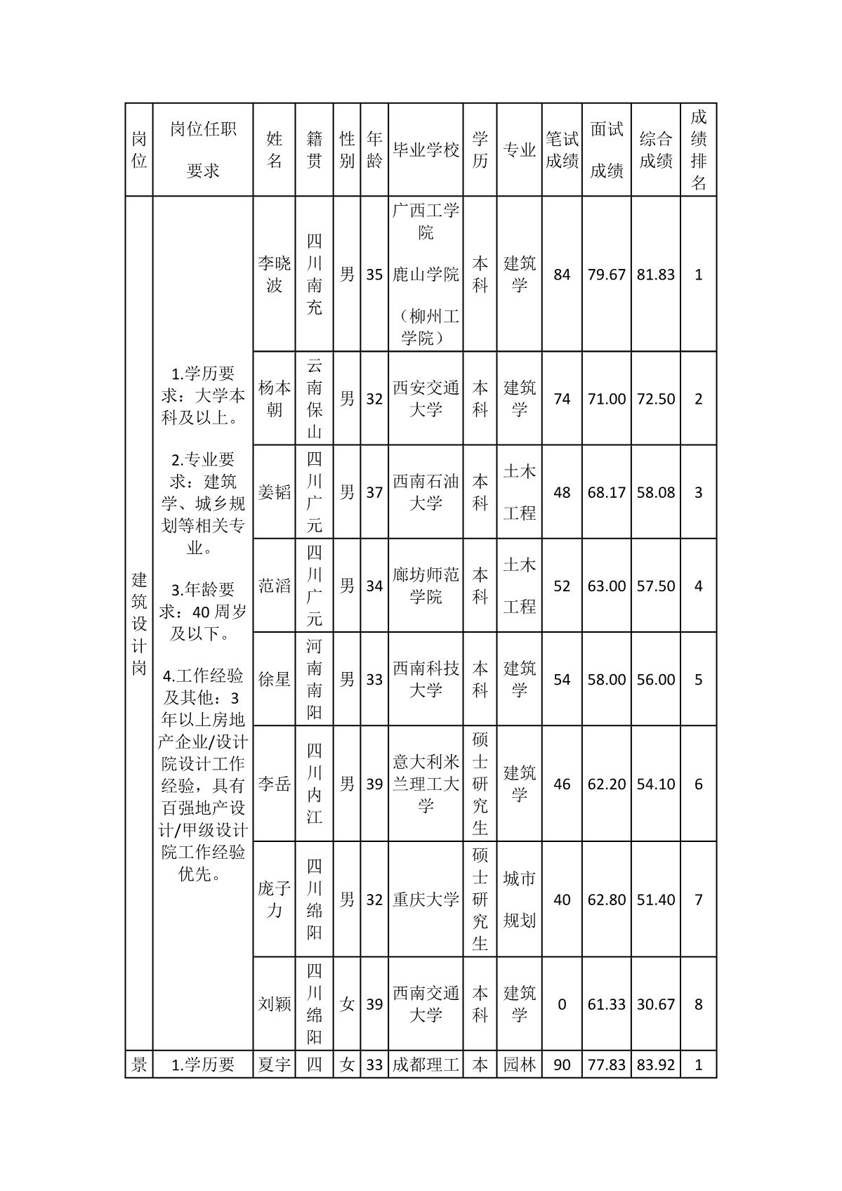 根據綿陽市綿投置地有限公司發(fā)布的招聘公告及招聘相關規(guī)定,經面試、筆試相關程序,現將建筑設計崗等6個崗位的綜合考評成績予以公示。