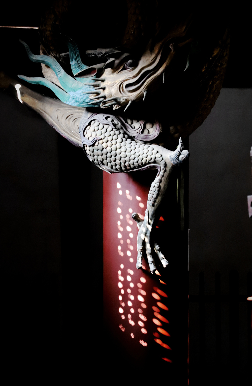 在寺內各殿屋脊上,有許多造型奇特的吻獸飾物。根據屋脊形式不同,安裝的吻獸數量不一,踞于正脊兩端體形似龍的動物稱為“大吻”或“鴟吻”,它張開巨口,用利齒咬住屋脊,尾部上卷,背插寶劍……這些造型奇特的動物,傳說是龍的9個兒子,雖然同為龍子,但長相各異,印證了“龍生九子,子子不同”之說。