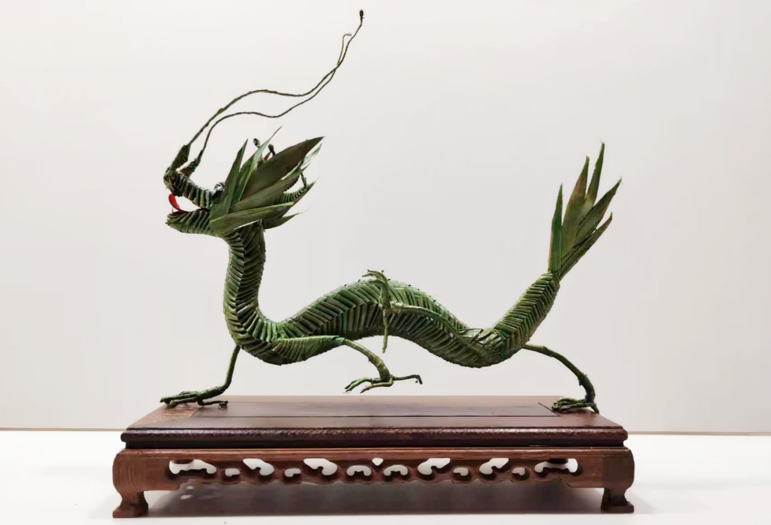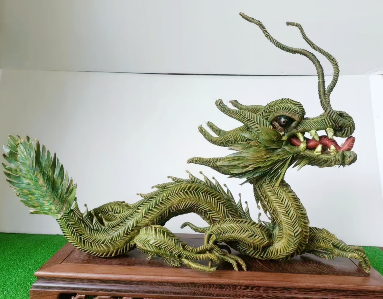 黃強(qiáng)從2004年開始學(xué)習(xí)羌族草編技藝,在繼承傳統(tǒng)技法的基礎(chǔ)上進(jìn)行工藝創(chuàng)新,結(jié)合人們的生活需求,研發(fā)草編草鞋以及生活飾品、擺件等,草編龍就是其中之一。近年來(lái),他與團(tuán)隊(duì)研發(fā)出不同規(guī)格、不同形態(tài)的草編中國(guó)龍,并多次帶出國(guó)門展示、展銷,受到世界各地友人的喜愛。