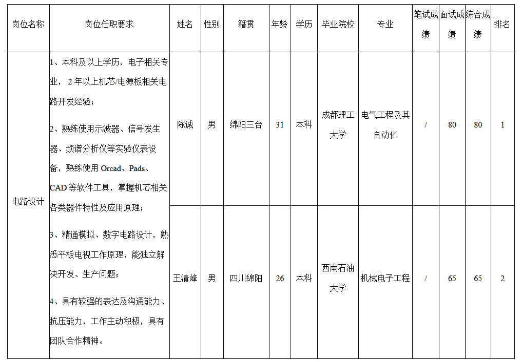 根據(jù)四川長虹電器股份有限公司(多媒體公司)發(fā)布的招聘公告及招聘相關(guān)規(guī)定,經(jīng)面試等程序,現(xiàn)將面試成績予以公示。