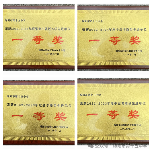 2024年2月19日,涪城區(qū)召開了2024年推進義務(wù)教育教學(xué)改革實驗區(qū)建設(shè)工作會,會上,表揚了2022-2023年度教育教學(xué)先進單位和先進個人,綿陽市第十五中學(xué)榮獲2022-2023年度“綜合績效考核先進單位一等獎”“中高考質(zhì)量先進單位一等獎”“教學(xué)質(zhì)量先進單位一等獎”“畢業(yè)生就近入學(xué)先進單位一等獎”殊榮。