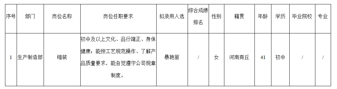 根據(jù)浙江長(zhǎng)虹飛獅電器工業(yè)有限公司發(fā)布的招聘公告及招聘相關(guān)規(guī)定,經(jīng)面試、體檢等程序,擬錄用暴艷麗同志到浙江長(zhǎng)虹飛獅電器工業(yè)有限公司工作,現(xiàn)予以公示,具體情況如下: