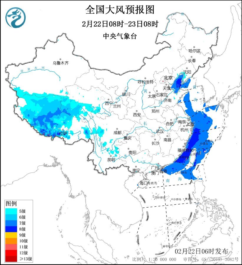 預(yù)計(jì),2月22日08時(shí)至23日08時(shí),西藏中西部、青海西南部、遼東半島、云南東部等地的部分地區(qū)有5~6級(jí)大風(fēng),陣風(fēng)7~8級(jí);渤海、渤海海峽、黃海西部海域、東海西部海域、臺(tái)灣海峽、臺(tái)灣以東洋面、南海東北部將有7-8級(jí)、陣風(fēng)9級(jí)的偏北到東北風(fēng)。