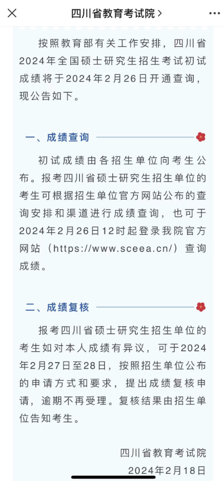 其中,四川省2024年全國碩士研究生招生考試初試成績將于2024年2月26日開通查詢。