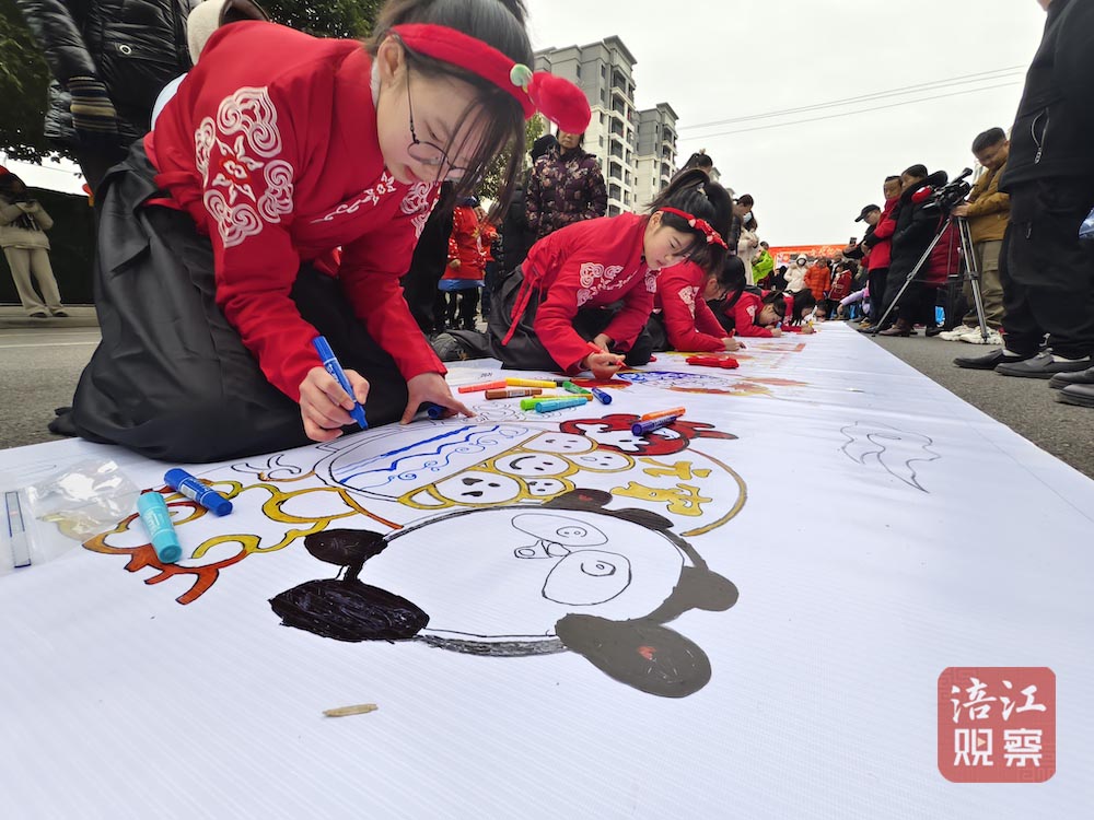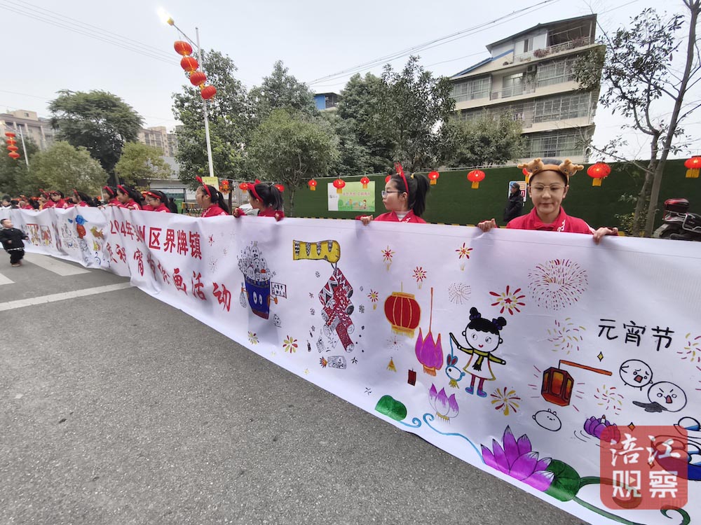 大紅燈籠、可愛的湯圓寶寶、威武雄壯的巨龍、炫彩斑斕的煙花……長長的畫卷平鋪開來,來自界牌小學(xué)的孩子們用靈活的小手和豐富的想象力表達(dá)對節(jié)日的祝福和家鄉(xiāng)的熱愛。