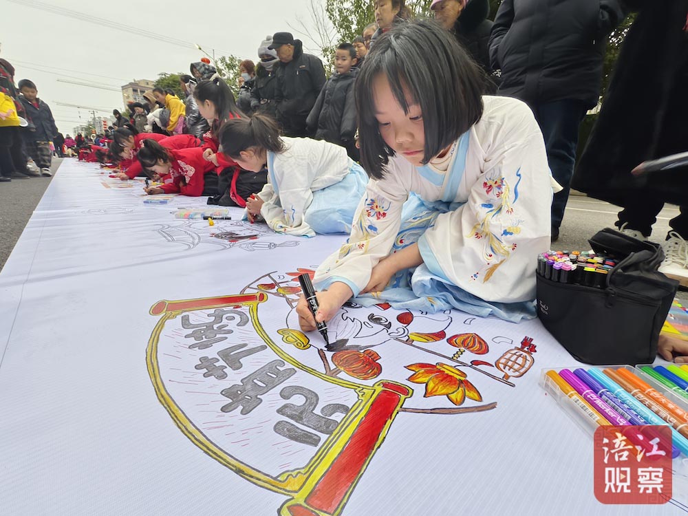 在安州界牌鎮(zhèn),33名孩子現(xiàn)場作出長達(dá)33米的元宵主題繪畫長卷。