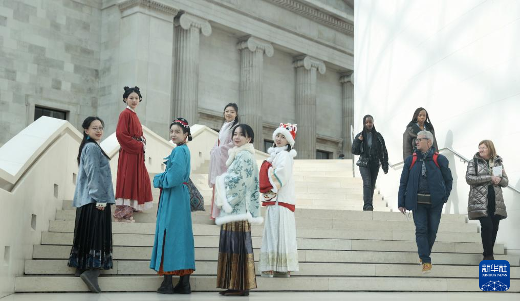2月25日,漢服愛好者在英國倫敦大英博物館展示漢服。