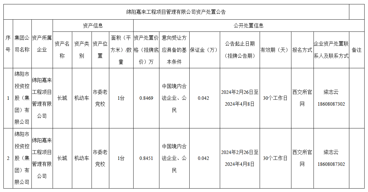 綿陽嘉來工程項(xiàng)目管理有限公司資產(chǎn)處置公告