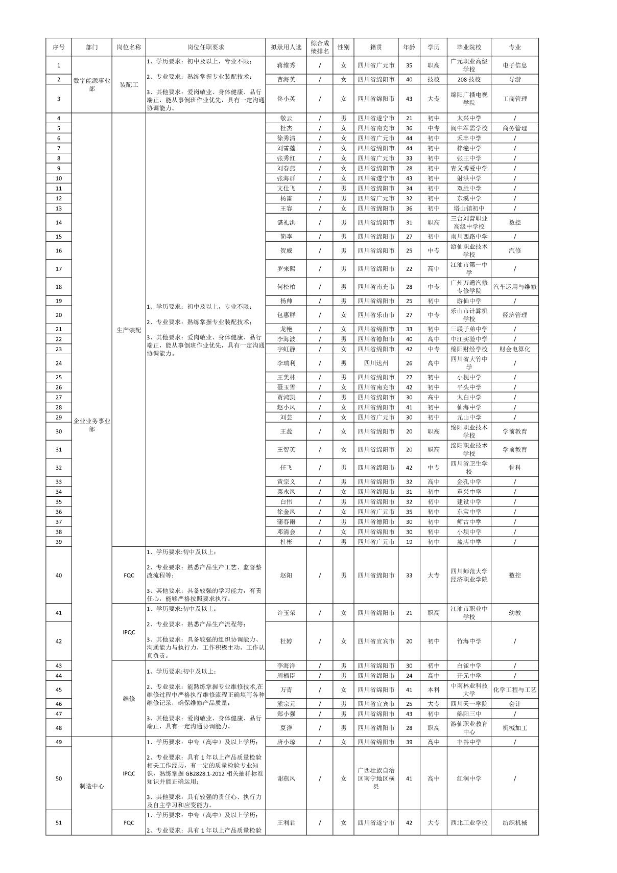 根據(jù)四川九州電子科技股份有限公司發(fā)布的招聘公告及招聘相關(guān)規(guī)定,經(jīng)筆試、面試、考察、體檢等程序,擬錄用蔣維秀等54名同志到四川九州電子科技股份有限公司工作,現(xiàn)予以公示,具體情況如下: