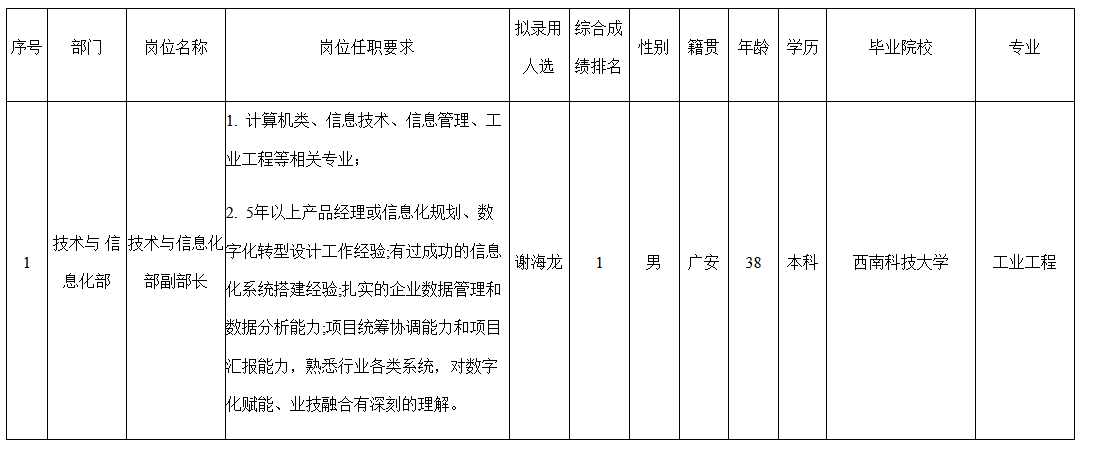 根據(jù)四川九州線纜有限責(zé)任公司發(fā)布的招聘公告及招聘相關(guān)規(guī)定,經(jīng)面試、考察、體檢等程序,擬錄用謝海龍同志到四川九州線纜有限責(zé)任公司工作,現(xiàn)予以公示,具體情況如下:
