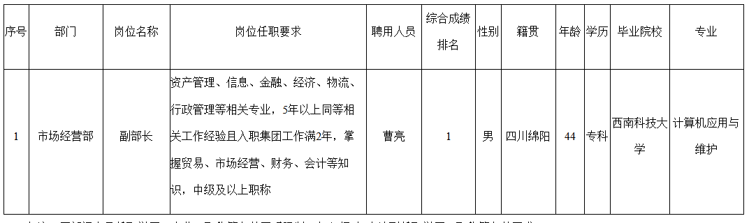 根據(jù)綿陽(yáng)科達(dá)實(shí)業(yè)投資控股有限責(zé)任公司發(fā)布的內(nèi)部中層管理人員競(jìng)聘公告及競(jìng)聘相關(guān)規(guī)定,經(jīng)面試、考察等程序,擬聘用曹亮同志為綿陽(yáng)科達(dá)實(shí)業(yè)投資控股有限責(zé)任公司中層管理人員,現(xiàn)予以公示,具體情況如下: